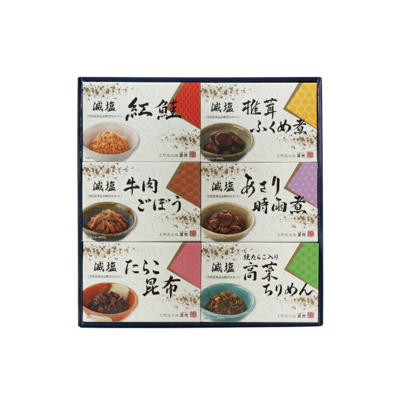 減塩佃煮・惣菜詰合せ 詰め合わせ セット 減塩紅鮭 減塩椎茸ふくめ煮 減塩あさり時雨煮 減塩たらこ昆布 減塩焼きたらこ入り高菜ちりめん 減塩牛肉ごぼう 内祝い 結婚内祝い 結婚祝い 引き出物 引っ越し 引越し お中元 お歳暮 新築祝 お返し ご挨拶 ギフト